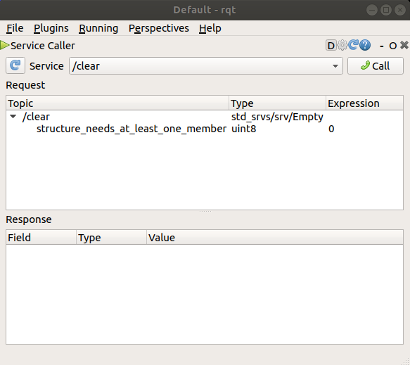rqtWhen running rqt for the first time, the window will be blank. No worries; just select Plugins > Services > Service Caller from the menu bar at the top.